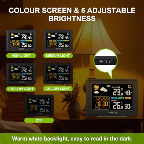 Scherm met hoge resolutie: draadloos weerstation met groot scherm, gemakkelijk af te lezen. Druk op de bovenste knop om de achtergrondverlichting gedurende 20 seconden in te schakelen. Dankzij het HD VA-display met led-achtergrondverlichting kun je gegevens op het scherm gemakkelijk vanuit meerdere hoeken bekijken. Vooral ’s nachts hoef je je geen zorgen te maken dat je het scherm niet kunt zien: druk gewoon op de knop om het te laten oplichten. Het licht is heel zacht, dus maak je geen zorgen over verblinding ’s nachts.
